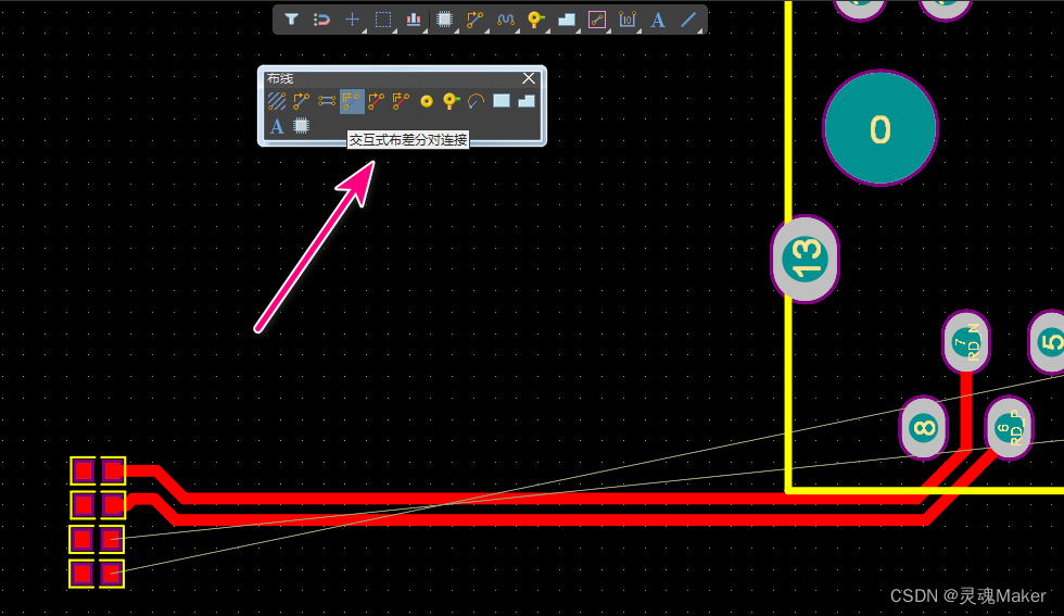 2.然后重新updata 到PCB,选用差分对布线,,布线时选用 “交互式布差分对连接”,点击其中一条差分线引脚,即可拉线
