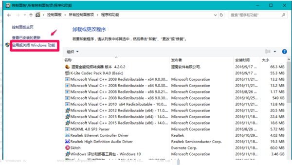 2.在程序和功能窗口,点击窗口左侧的【启用或关闭Windows功能】;