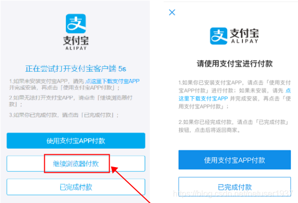 新版本问题:使用【支付宝APP付款】以后,点击【关闭】或【已完成付款】,页面无响应。