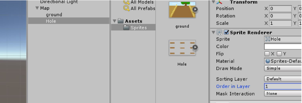 将hole图片拖入,建一个空物体,命名为map,将两张图片拖入空物体。