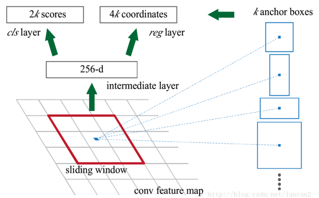 图2展示了RPN的整个过程,一个特征图经过sliding window处理,得到256维特征,然后通过两次全连接得到结果2k个分数和4k个坐标;相信大家一定有很多不懂的地方;我把相关的问题一一列举: