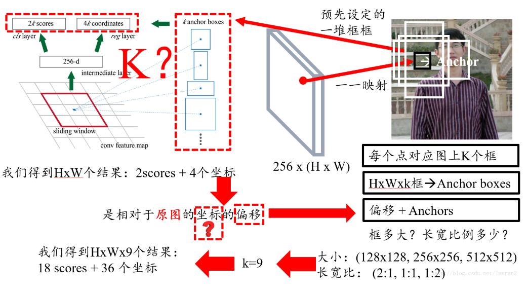 首先我们知道有H x W个结果,我们随机取一点,它跟原图肯定是有个一一映射关系的,由于原图和特征图大小不同,所以特征图上的一个点对应原图肯定是一个框,然而这个框很小,比如说8 x 8,这里8是指原图和特征图的比例,所以这个并不是我们想要的框,那我们不妨把框的左上角或者框的中心作为锚点(Anchor),然后想象出一堆框,具体多少,聪明的读者肯定已经猜到,K个,这也就是图中所说的K anchor boxes(由锚点产生的K个框);换句话说,H x W个点,每个点对应原图有K个框,那么就有H x W x k个框默默的在原图上,那RPN的结果其实就是判断这些框是不是物体以及他们的偏移;那么K个框到底有多大,长宽比是多少?这里是预先设定好的,共有9种组合,所以k等于9,最后我们的结果是针对这9种组合的,所以有H x W x 9个结果,也就是18个分数和36个坐标;