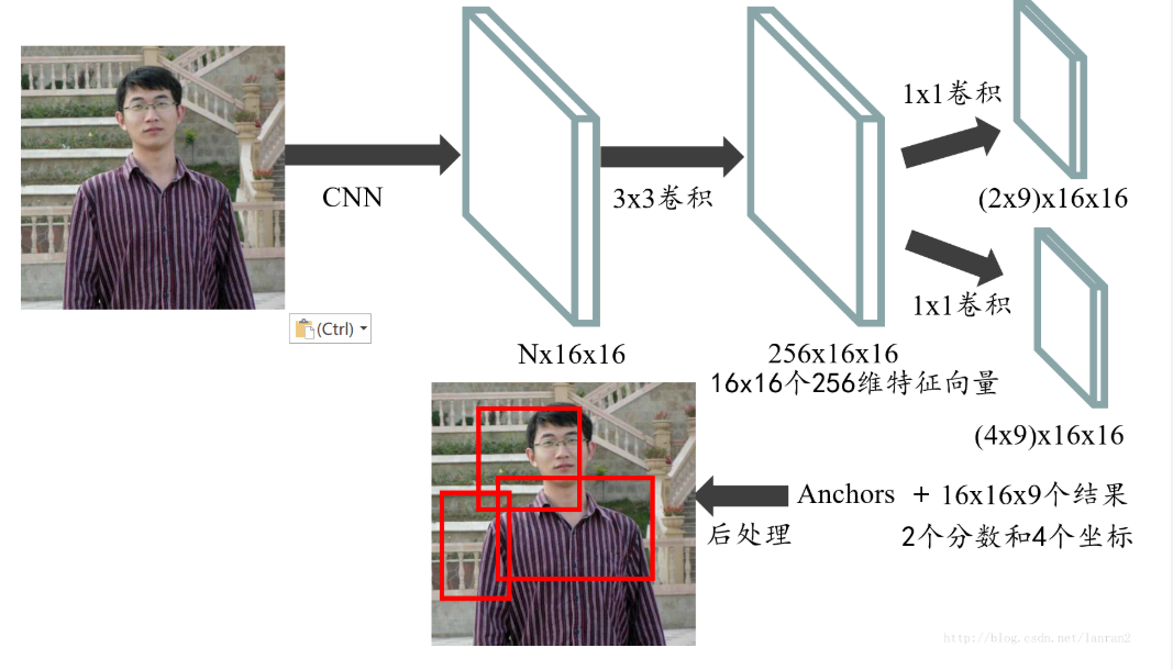 最后我们再把RPN整个流程走一遍,首先通过一系列卷积得到公共特征图,假设他的大小是N x 16 x 16,然后我们进入RPN阶段,首先经过一个3 x 3的卷积,得到一个256 x 16 x 16的特征图,也可以看作16 x 16个256维特征向量,然后经过两次1 x 1的卷积,分别得到一个18 x 16 x 16的特征图,和一个36 x 16 x 16的特征图,也就是16 x 16 x 9个结果,每个结果包含2个分数和4个坐标,再结合预先定义的Anchors,经过后处理,就得到候选框;整个流程如图5: