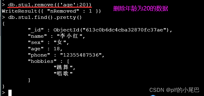 db.stu1.remove({'age':20}) //删除年龄为20的数据