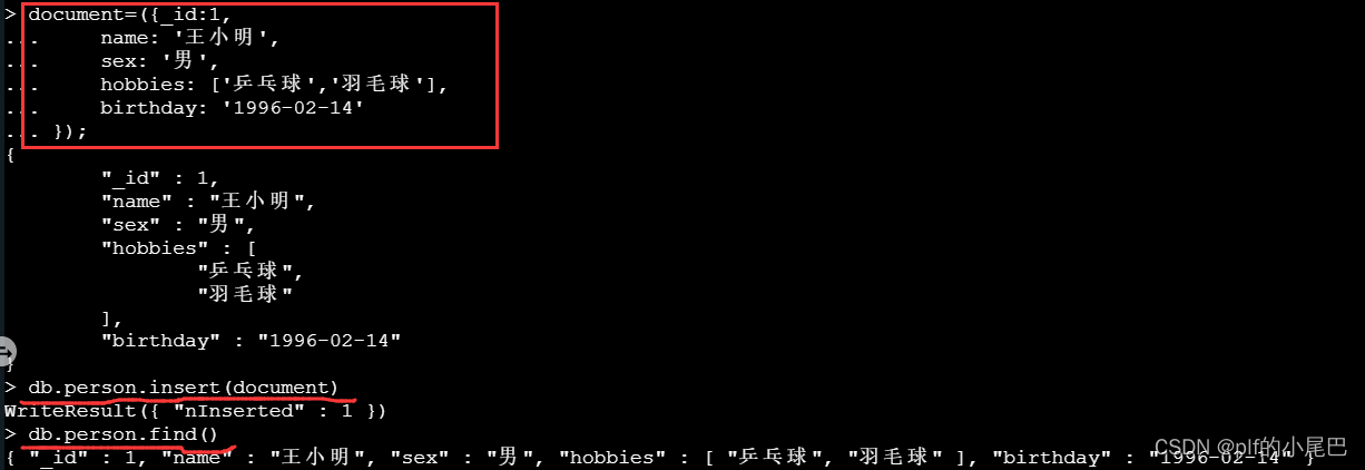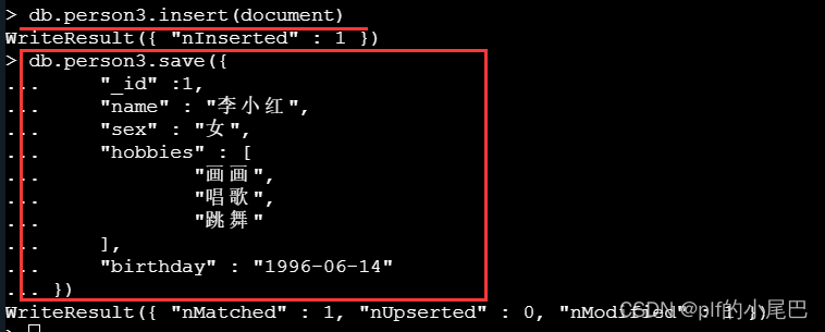 person 是集合名,如果该集合不在该数据库中,MongoDB 会自动创建该集合并插入文档