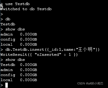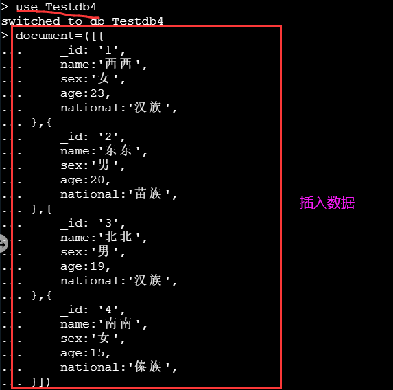 插入一些数据:db.testdb.insert({_id:1,name:”王小明”}) 用db.数据库名称.insert