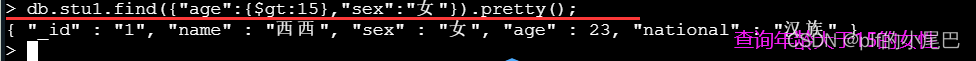 db.stu1.find({"age":{$gt:15},"sex":"女"}).pretty(); //在测试行里面要在$前面加\