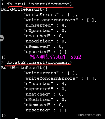 db.t_stu.insert([{"_id":1,"name":"小明","sex":"男","hobbies":["乒乓球","羽毛球"]},{"_id":2,"name":"小红","sex":"女","hobbies":["画画","唱歌"]}])