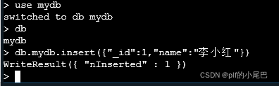 db.mydb.insert({“_id”:1,”name”:”李小红”})