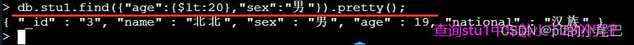 db.stu1.find({"age":{$lt:20},"sex":"男"}).pretty();