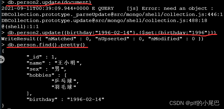 5、更新文档:db.person2.update({birthday:"1996-02-14"},{$set:{birthday:"1996"}})