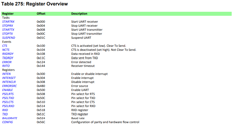 - TXDRDY、RXDRDY:TXD每写入一字节数据,就会产生TXDRDY事件;有数据进入到RXD,就会产生RXDRDY事件。