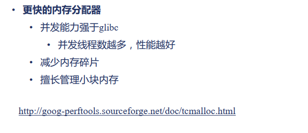 与标准的glibc库的malloc相比,TCMalloc在内存的分配效率和速度要高,可以在高并发的情况下很好的控制内存的使用,提高服务器的性能,降低负载。