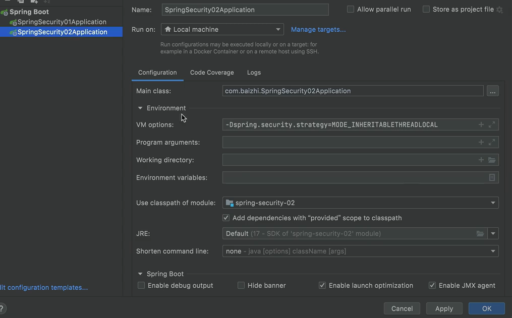 SpringSucurity 允许多线程的子线程获取登录认证信息 在启动项里配置 VM options:-Dspring.security.strategy=MODE_INHERITABLETHREADLOCAL版权声明:本文为m0_47603004原创文章,遵循CC 4.0 BY-SA版权协议,转载请附上原文出处链接和本声明。原文链接:https://blog.csdn.net/m0_47603004/article/details/123623029