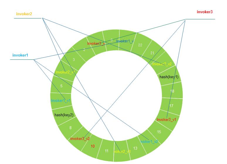 当一个接口方法参数(一个或者多个连接后)hash后得到的hash(key1)值19,那么它应该调用invoker2_v2节点,实际就是invoker2真实节点。