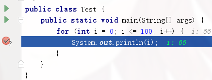 2、在 System.out.println(i);这句话的左侧单击一下,出现一个红色的点,即为断点