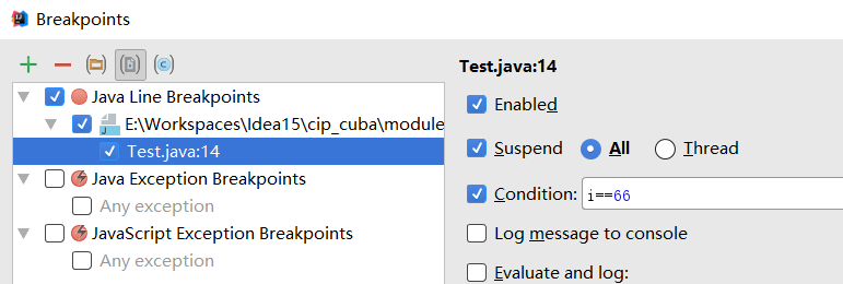 3、右击断点,弹出如下对话框,在Condition 框里输入条件 i==66