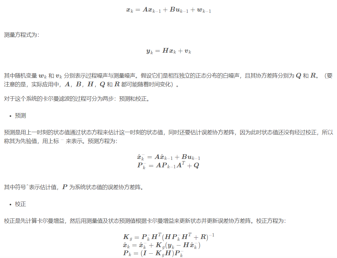 卡尔曼滤波器用来解决用线性微分方程描述的离散时间控制过程中的状态估计问题。其目标是使系统状态的估计值有最小均方误差。卡尔曼滤波器来源于匈牙利数学家卡尔曼的博士论文,推导过程这里就不多赘述了,在诸多文献中都有讲解,我们直接讲怎么用。