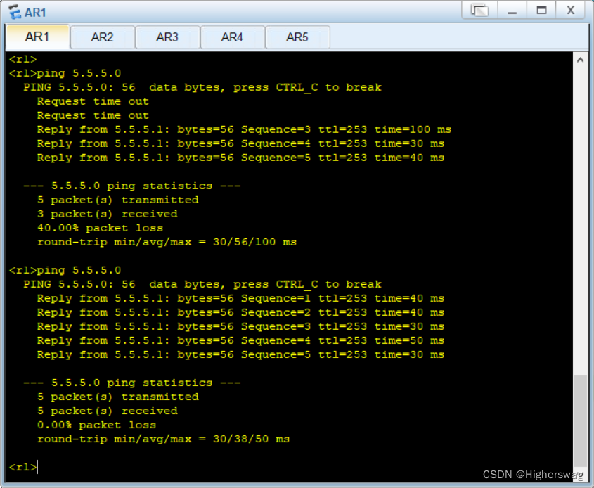 [r5]ip route-static 192.168.1.0 14 192.168.1.81 preference 61实验结果