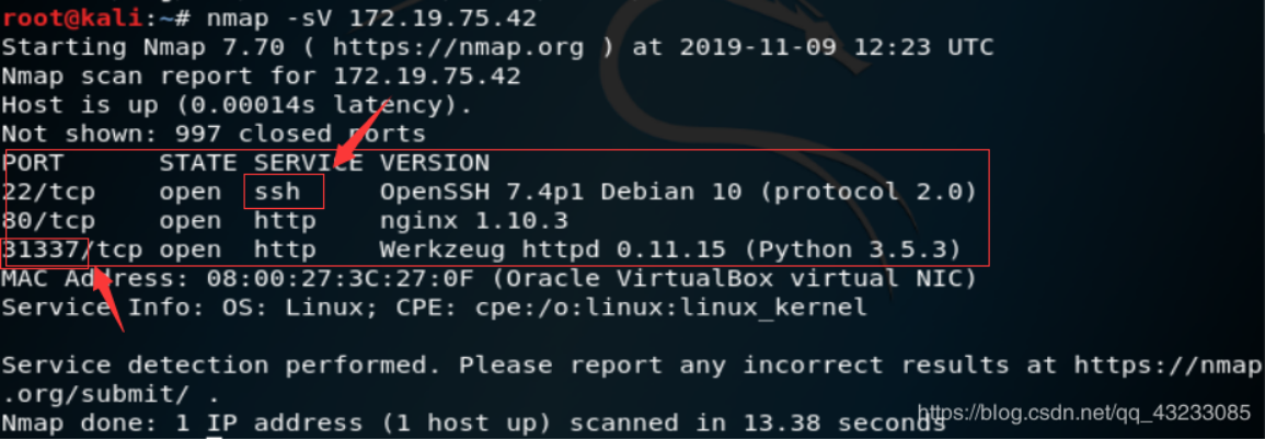 nmap -sV 172.19.75.42,发现开着三个服务,ssh是我们要攻击的服务,31337是特殊端口,常用端口为0~1023,针对特殊端口进行探测,尤其对开发大端口的http服务进行排查。
