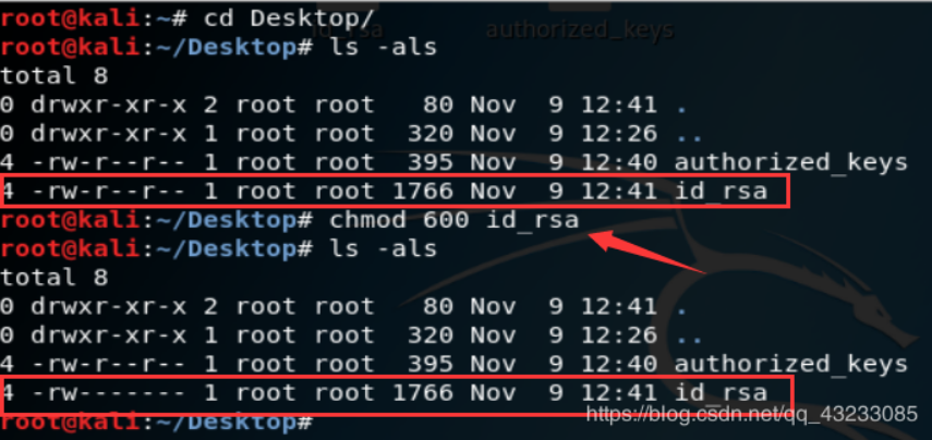 接下来我们先切换到桌面,对私钥进行赋读写权限,ls -alh查看权限,chmod 600 文件名