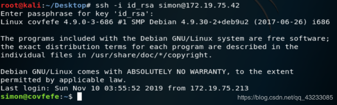有了私钥,我们就可以尝试使用ssh命令对靶机进行远程登录(ssh -i 私匙 用户名/id 用户名在认证关键字中泄露)