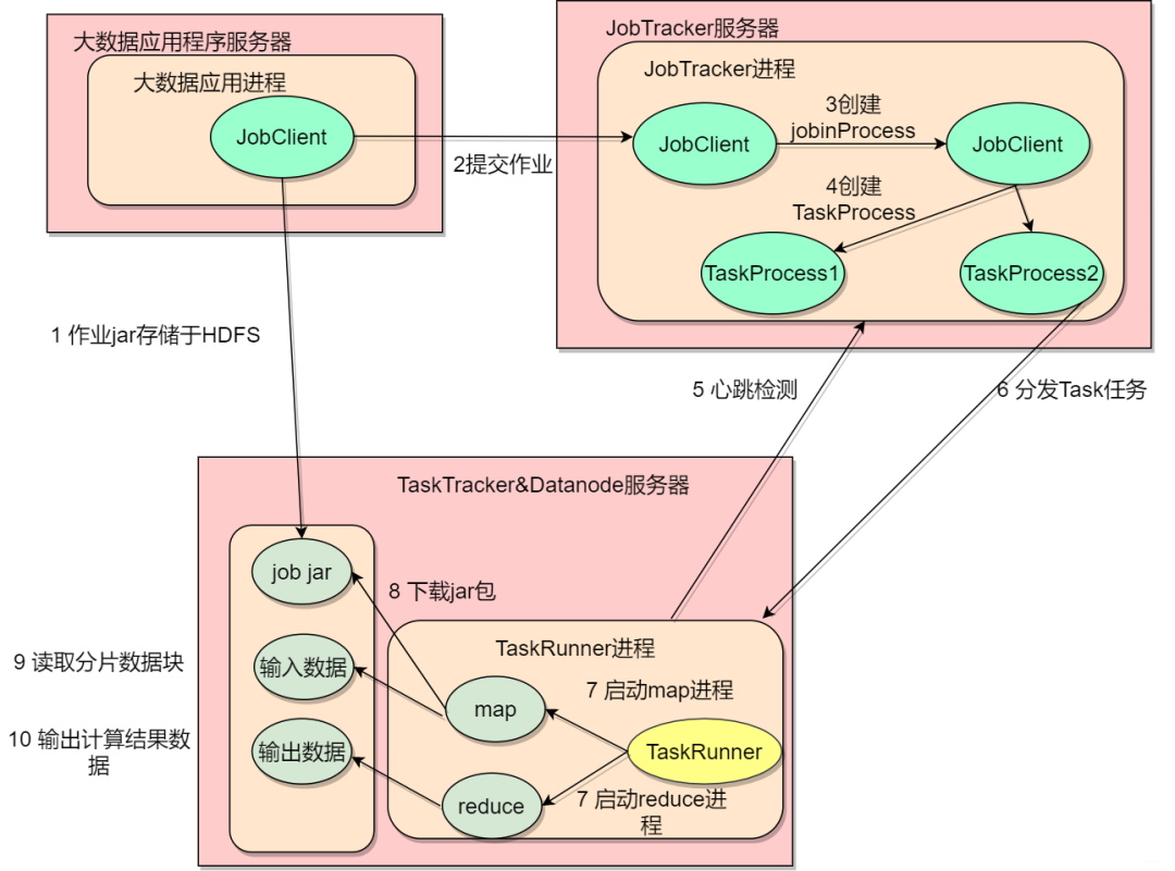 上图比较清晰地阐述的整个过程,再描述一波。MR中主要是两种进程角色,分别为 JobTracke r和 TaskTracker 两种,JobTracker在集群中只有一个,而 TaskTracker 存在多个,当 JobClient 启动后,往 JobTracker 提交作业,JobTracker查看文件路径决定在哪些服务器启动 Map 进程,然后发送命令给 TaskTracker,告诉它要准备执行任务了,TaskTracker收到任务后就会启动 TaskRunner 下载任务对应的程序。map计算完成,TaskTracker对map输出结果 shuffer 操作然后加载 reduce 函数进行后续计算,这就是各个模块协同工作的简单过程。