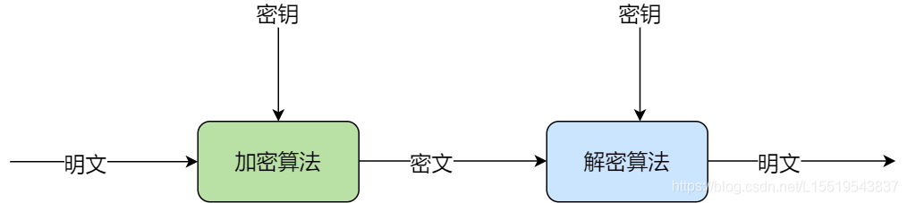 对称加密是通过一个加密算法和密钥,对一段明文进行加密后得到密文,然后使用相同的密钥和对应的解密算法进行解密得到明文。