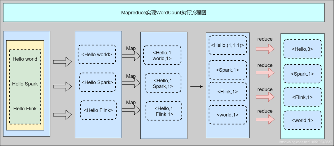 下面以WordCount统计所有数据中相同的词频数据为例,详细看看Map和Reduce的过程。