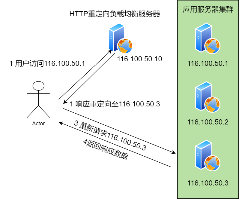 也属于比较直接,当HTTP请求叨叨负载均衡服务器后,使用一套负载均衡算法计算到后端服务器的地址,然后将新的地址给用户浏览器,浏览器收到重定向响应后发送请求到新的应用服务器从而实现负载均衡,如下图所示