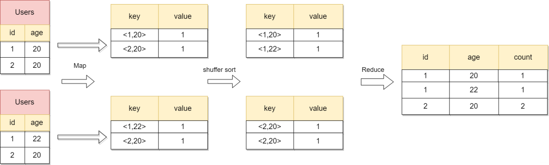 大数据处理经典的处理框架即MapReduce,分为Map和Reduce两个阶段,其中一个Map过程是将每个服务器上启动Map进程,计算后输出一个集合。reduce过程,MapReduce在每个服务器上启动多个reduce进程,然后将所有的map输出的集合进行shuffle操作,什么是shuffle操作呢,即是将相同的ekey发送到同一个reduce进程,在reduce中完成数据关联的操作。