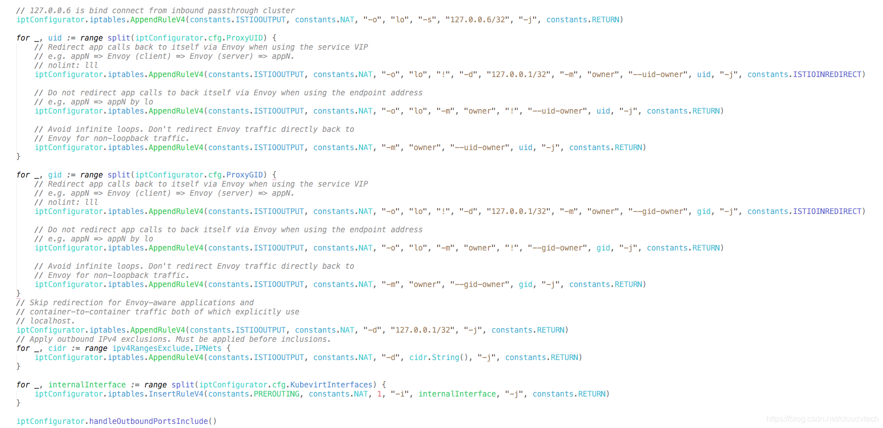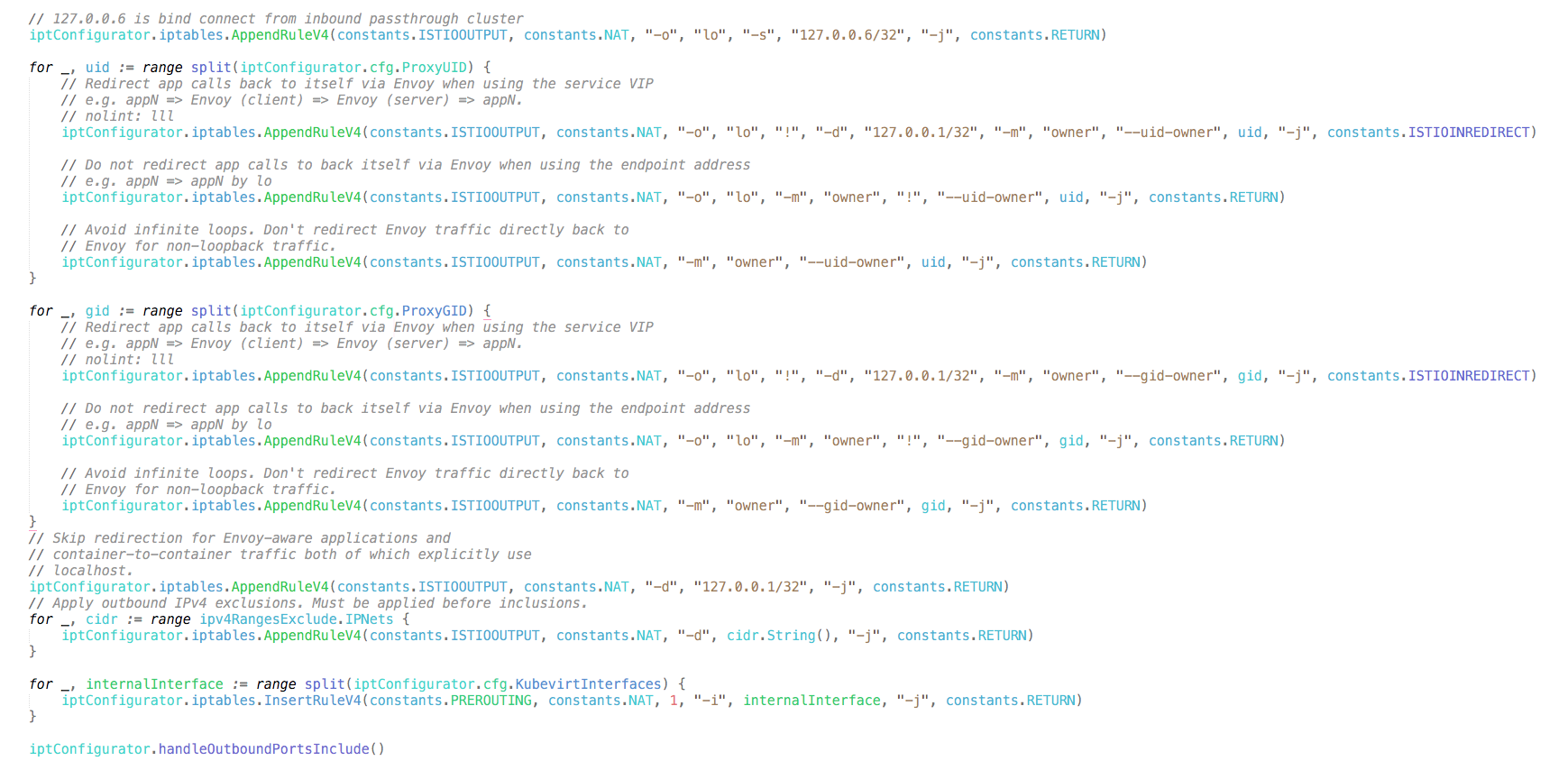 - 也可以参考如下代码中原汁原味的注释进行理解:https://github.com/istio/istio/blob/master/tools/istio-iptables/pkg/cmd/run.go