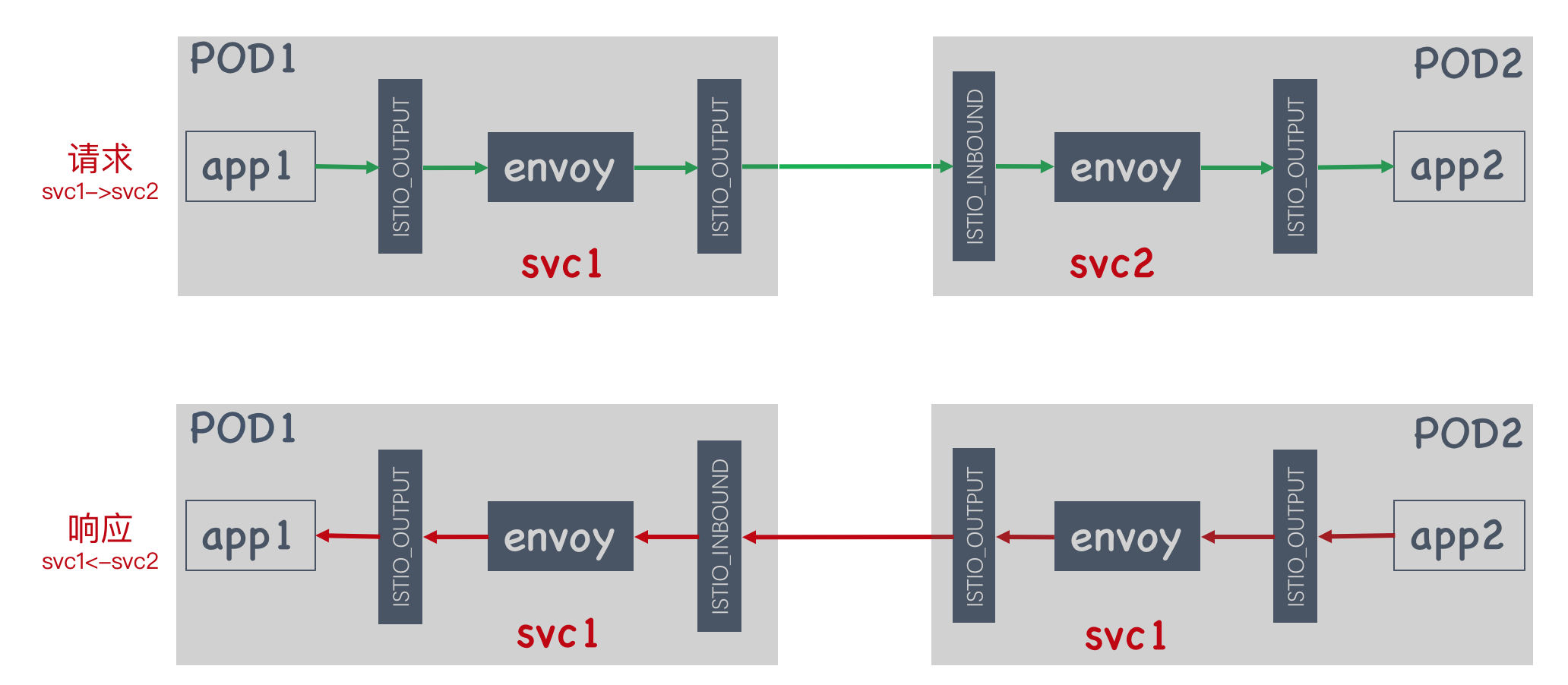 - 进入和流出istio proxy sidecar和业务容器的流量都需要分别经过ISTIO_INBOUND和ISTIO_OUTPUT的处理