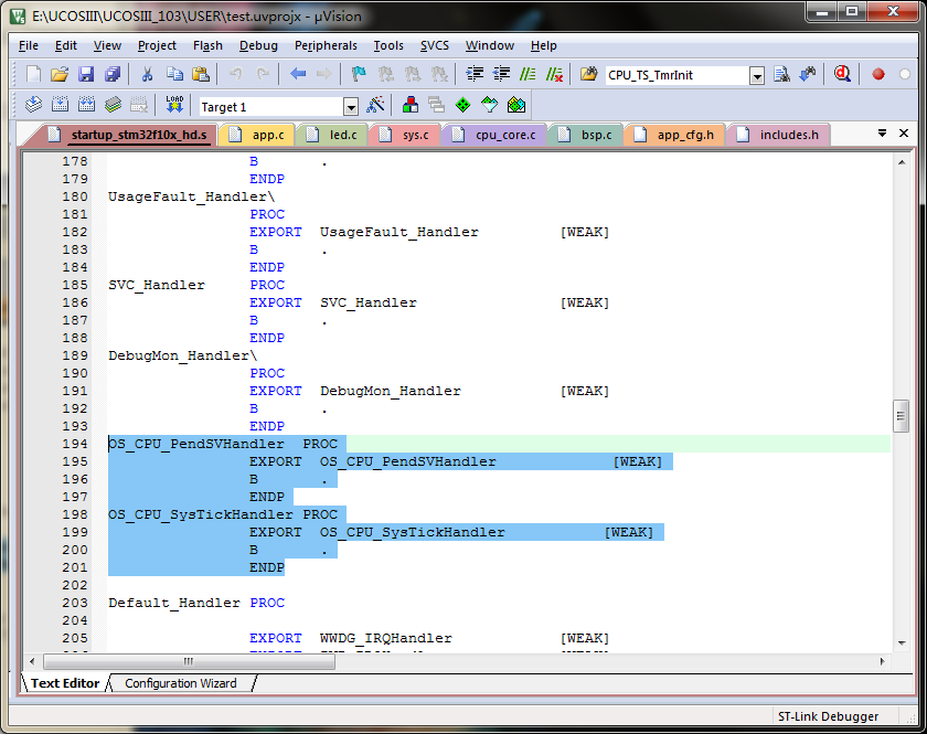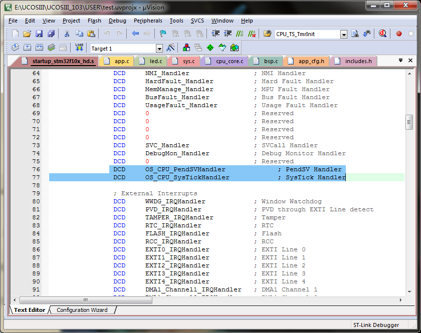 10、找到启动文件startup_stm32f10x_hd.s,找到PendSV_Handler和SYSTick_Handler分贝修改成OS_CPU_PendSVHandler和OS_CPU_SysTickHandler