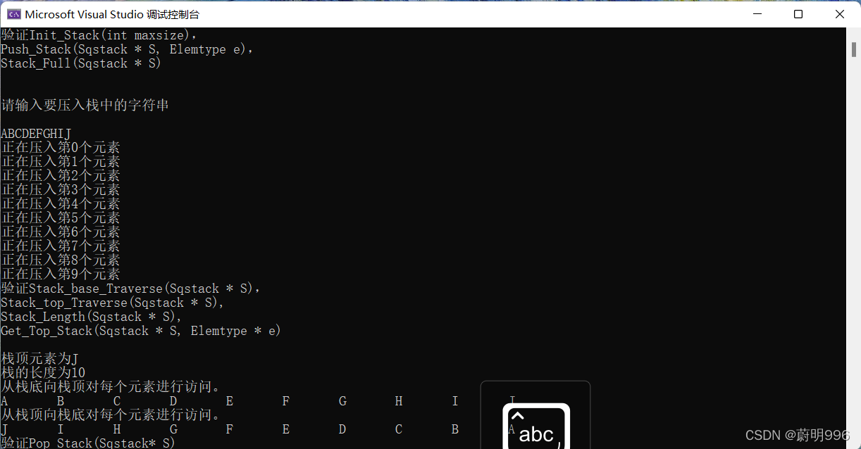 puts("验证Stack_base_Traverse(Sqstack * S),\nStack_top_Traverse(Sqstack * S),\nStack_Length(Sqstack * S),\nGet_Top_Stack(Sqstack * S, Elemtype * e)\n");