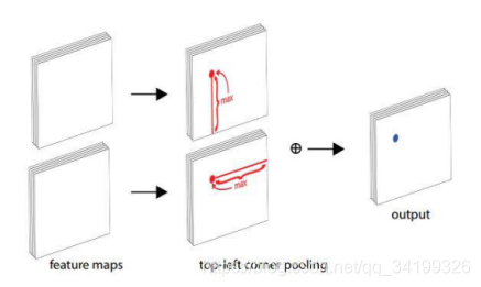 hourglass module后会有两个输出分支模块,分别表示左上角点预测分支和右下角点预测分支,每个分支模块包含一个corner pooling层和3个输出:heatmaps、embeddings和offsets。heatmaps是输出预测顶点信息,可以用维度为C*H*W的特征图表示,其中C表示目标的类别(注意:没有背景类),这个特征图的每个通道都是一个mask,mask的每个值(范围为0到1)表示该点是顶点的分数;embeddings用来对预测的corner点做group,也就是找到属于同一个目标的左上角角点和右下角角点;offsets用来对预测框做微调,这是因为从输入图像中的点映射到特征图时有量化误差,offsets就是用来输出这些误差信息。