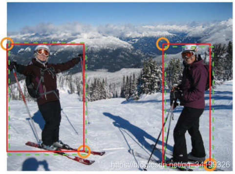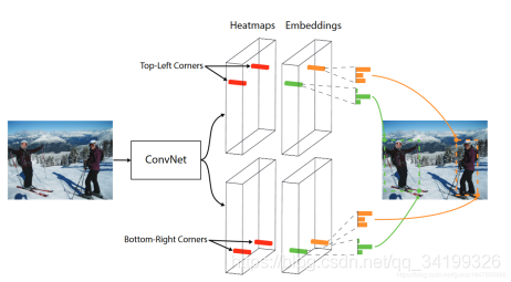 CornerNet的第三个输出是embedding,对应文章中group corner的内容。前面介绍了关于顶点的检测,在那部分中对顶点的预测都是独立的,不涉及一个目标的一对顶点的概念,因此如何找到一个目标的两个顶点就是第三个输出embedding做的工作。如图6,一共预测了4个点,那如何确定哪两个点是一组(哪两个是绿色的,哪两个是橘色的)这部分是受associative embedding那篇文章的启发,简而言之就是基于不同角点的embedding vector之间的距离找到每个目标的一对角点,如果一个左上角角点和一个右下角角点属于同一个目标,那么二者的embedding vector之间的距离应该很小。