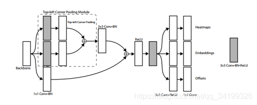 需要注意网络有两个分支,一个分支预测Top-left Corners,另一个预测Bottom-right corners。每个分支有三个线路,heatmaps预测哪些点最有可能是Corners点,embeddings主要预测每个点所属的目标,最后的offsets用于对点的位置进行修正,下面进行每部分的详细介绍