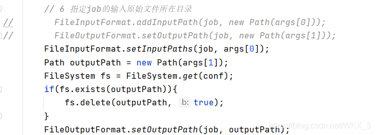 下图是mapreduce程序中main函数设置job的输入原文件所在的目录,如果你用了图中被注释掉的两行设置目录,则需要每次在集群上执行jar前将output目录删除;但输如果是非注释部分设置目录,则不需删除该目录。