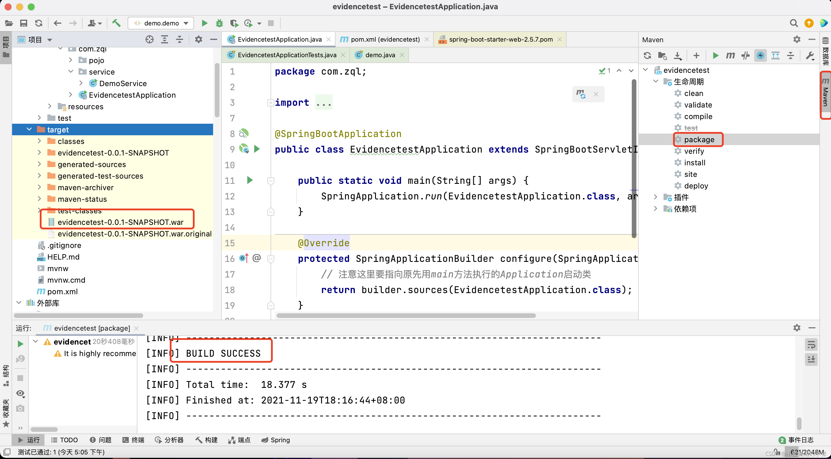 </plugins>6、在IDEA中使用mvn clean命令清除旧的包,并使用mvn package生成新的war包