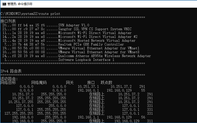 - 查看电脑内部路由规则,在命令行执行“ route print ”,命令,如下图所示: