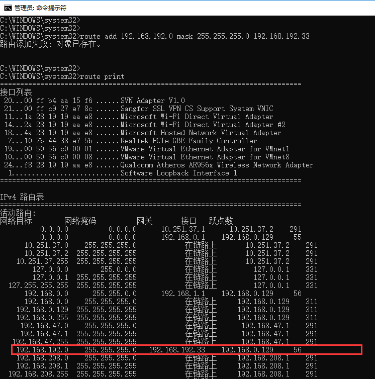 例如:route change 192.168.192.0 mask 255.255.255.0 -p192.168.192.55,如下图所示: