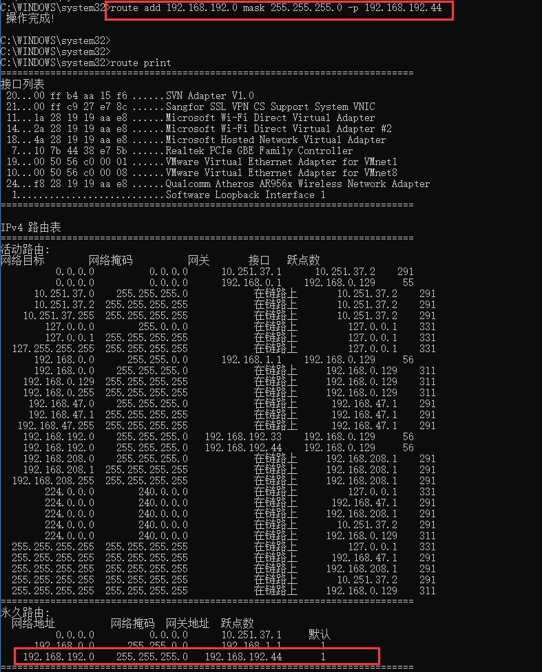 例如:route add 192.168.192.0 mask 255.255.255.0 -p 192.168.192.44,如下图所示: