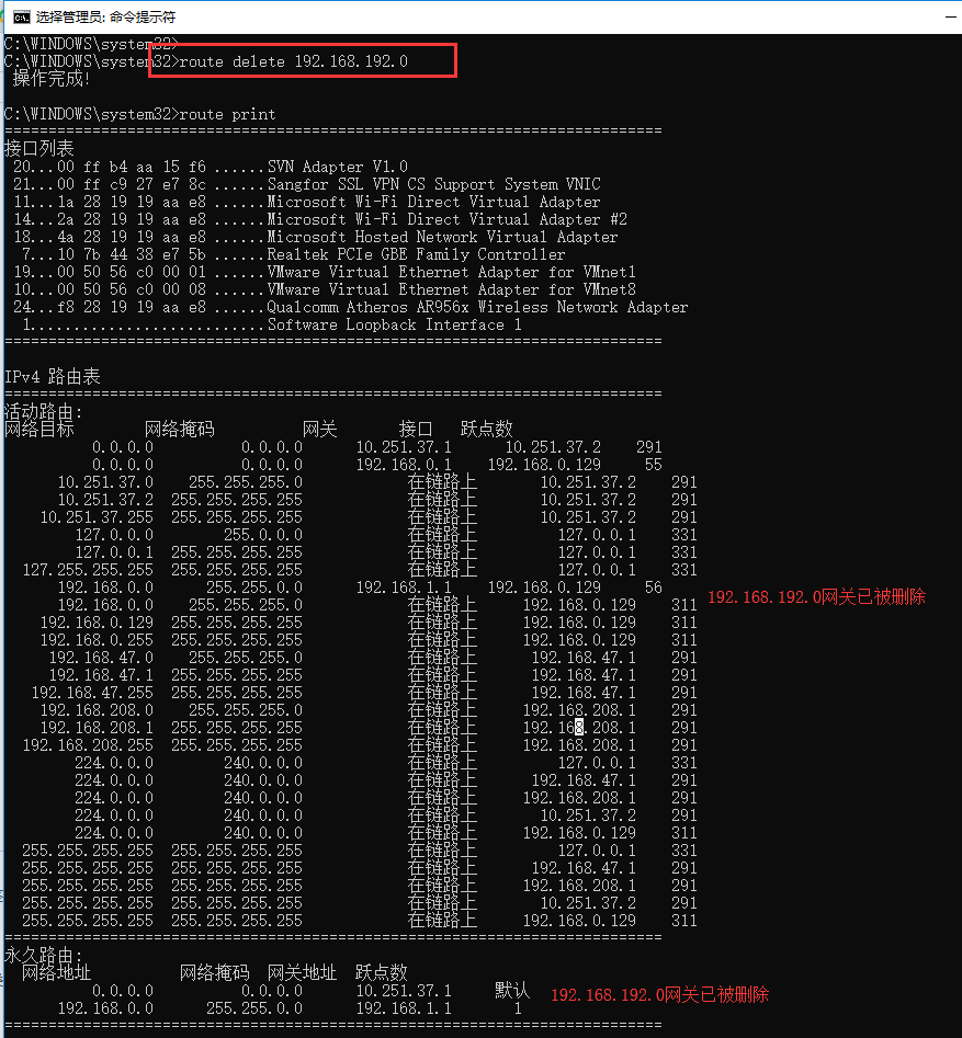 例如:route delete 192.168.192.0,如下图所示: