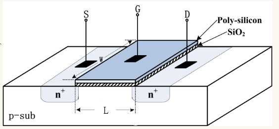 [1]以NMOS为例,在P在一块p型衬底(p-sub,衬底又叫Bulk或Body)上,通过选择掺杂形成两个的n+区,分别为源极(Source)和漏极(Drain);衬底之上用SiO2做一块绝缘层,绝缘层之上用高掺杂的多晶硅(Poly-silicon)做栅极,称作多晶硅栅,即为栅极(Grid);栅在源漏方向的长度称作栅的长L,垂直方向称为栅的宽W,需要注意的是,在数量上W比L要大。
