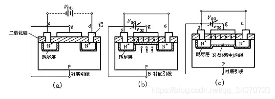 在漏源间加电压vDS,栅源无电压时,两个N+之间无法导通,因为漏极d和源极s之间有两个背靠背的PN结,而且不论vDS的极性如何总有一个PN结处于反偏状态,漏源极间没有导电沟道,所以这时漏极电流iD≈0。如上图1(a)