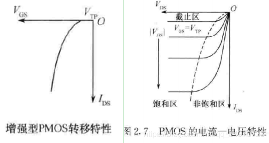 PMOS管与NMOS管相似,只是相反的是需要在栅上相对于源极施加负电压,栅上施加的是负电荷电子,而在衬底感应的是可运动的正电荷空穴和带固定正电荷的耗尽层。当达到强反型时(到达阈值电压VTP),在相对于源端为负的漏源电压的作用下,源端的正电荷空穴经过导通的 P 型沟道到达漏端,形成从源到漏的源漏电流。同样的vGS越负(绝对值越大),沟道的导通电阻越小,电流的数值越大[4]。其电流特性如下图2.7所示: