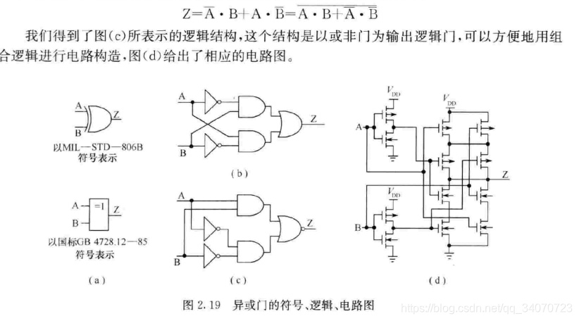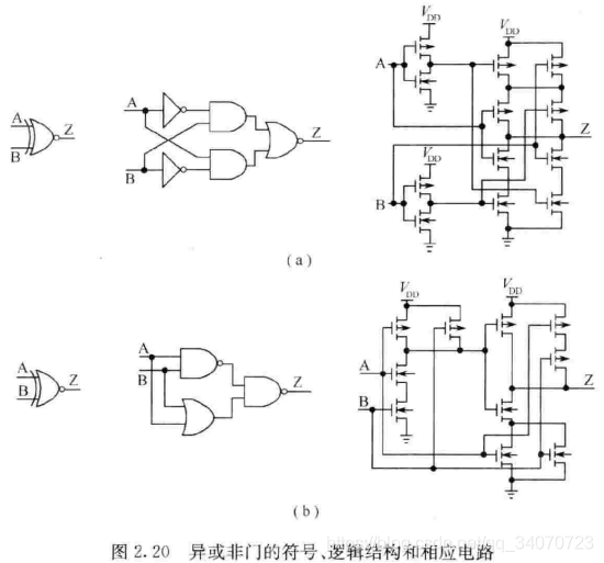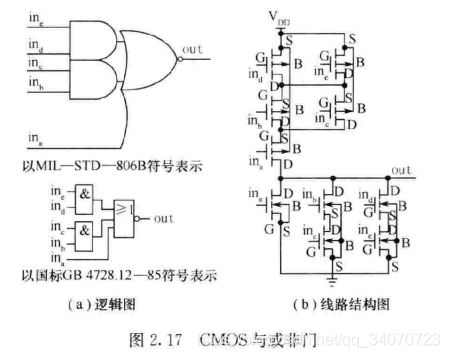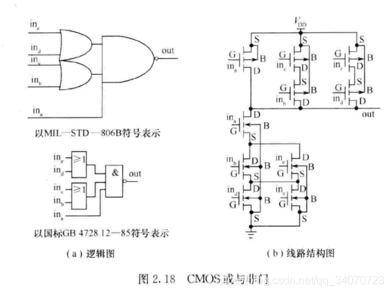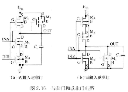 如图2.16(a)与非门NAND:上并下串,任意一个输入为低电平,下面有NMOS会截止,电阻极大而输出高电平