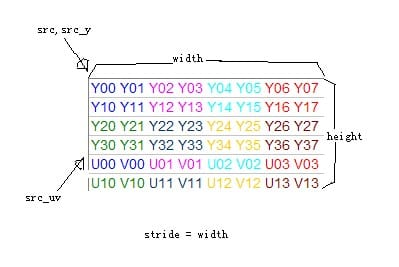 NV12 的采样比是 4:2:0,它是 semi planar 存储方式,先存储 Y 分量,后面 Cb 和 Cr 分量一起存储,Cb 在前,Cr 在后: