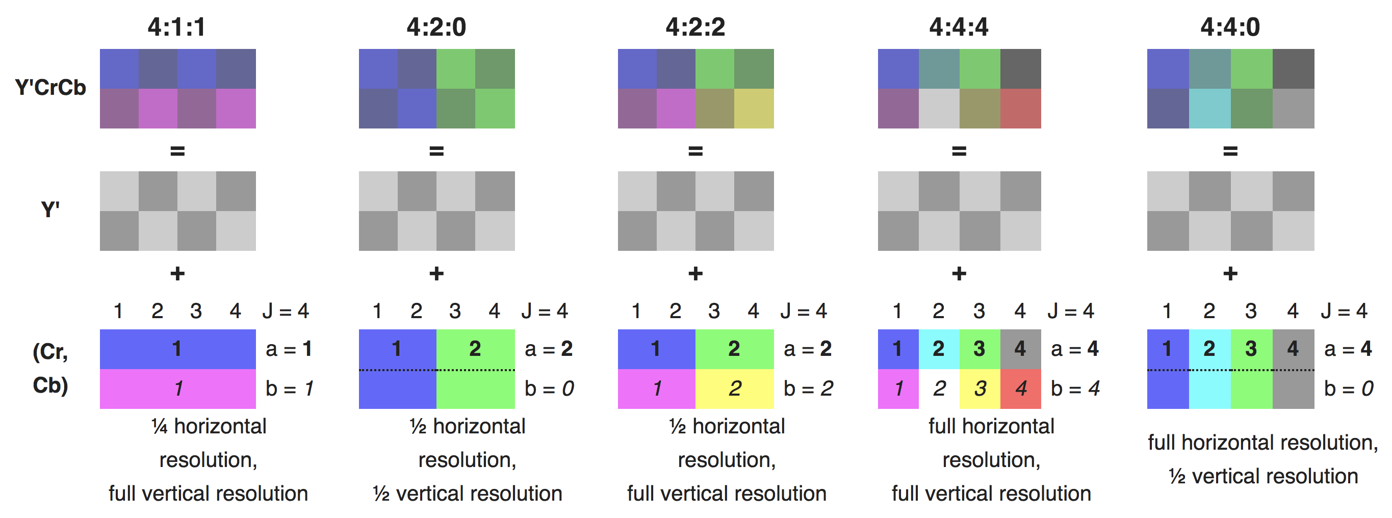 采样比通常表示为 J:a:b,以表示一个宽为 J 像素、高为 2 像素的采样区域内 Y Cb Cr(Y U V)的采样比: